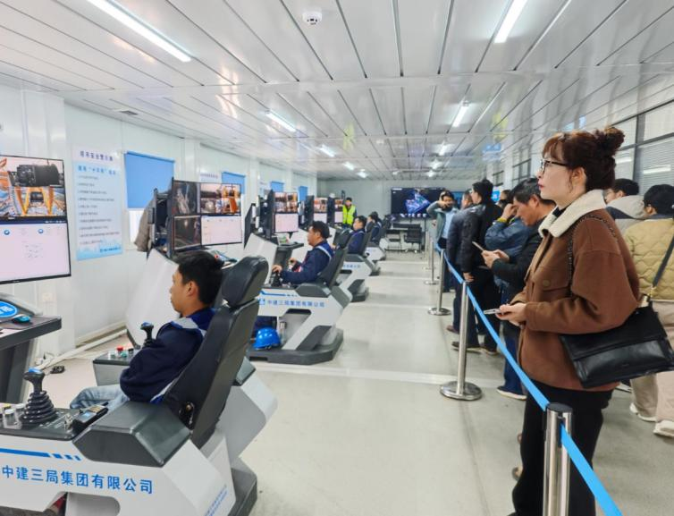 接着走进智能装备集控中心,教师们目睹了通过大屏幕的智能施工设备如何实现高效协同作业,这些高科技装备不仅提高了施工效率,还显著降低了人工劳动强度和安全风险。项目负责人详细介绍了设备的运作原理和实际应用场景,让教师们对智能建造技术的先进性有了直观的认识。