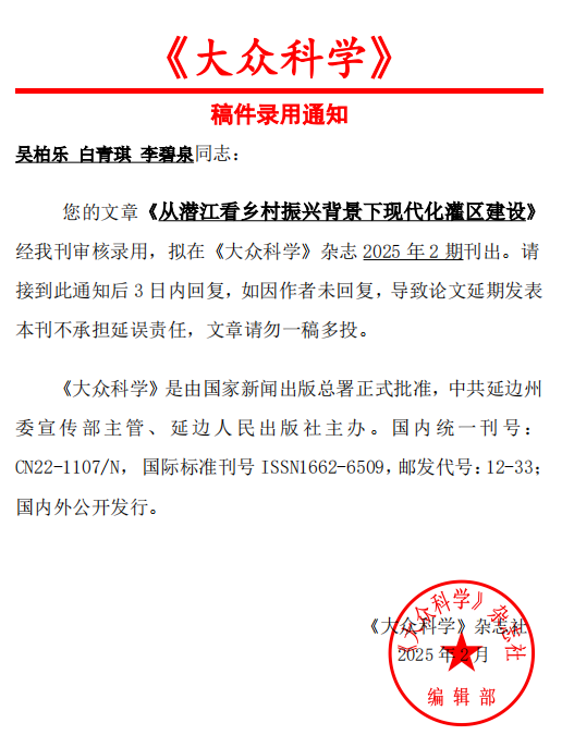 由机械工程系24级学生吴柏乐和土木工程系22级学生白青琪 李碧泉联合撰写的论文《从潜江看乡村振兴背景下现代化灌区建设》被吉林中共延边州委宣传部主管、延边人民出版社主办的《大众科学》杂志录用,并于 2025年2期刊出。