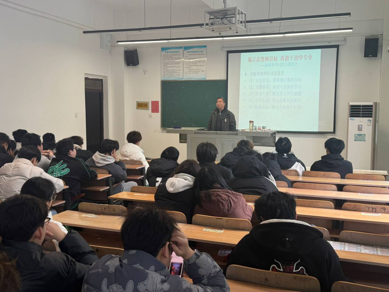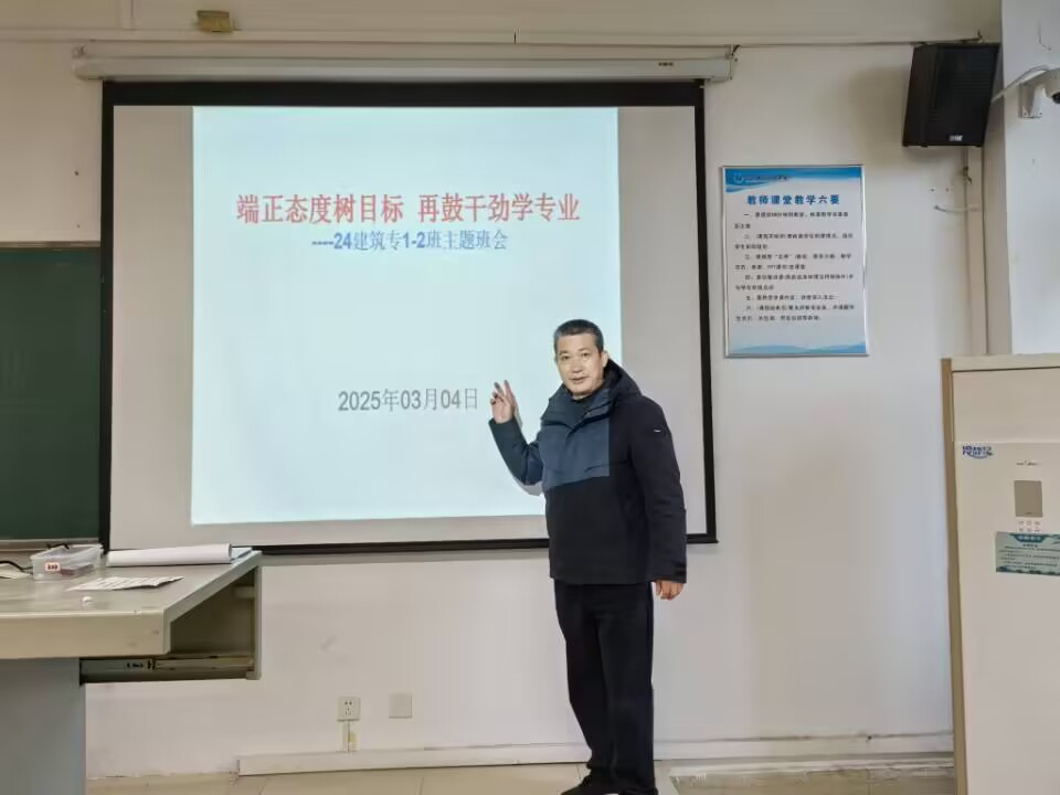 本网讯(通讯员梅鸿儒 童瑶 龚澳)为了进一步引导学生顺利完成学业,协助辅导员搞好学风建设,24建筑专1-2班班主任龙振华、徐卫国老师,于2025年03月04日中午,在教3-322教室联合召开《端正态度树目标 再鼓干劲学专业》主题班会。会议由徐卫国老师主持,24建筑专1-2班全体同学参加。整个活动共分4个流程:(1)徐卫国老师回顾2个班上学期学习情况。(2)班长介绍本学期开学班级学习状态。(3)学生代表介绍上学期经验和目前打算。(4)龙振华老师作动员发言。